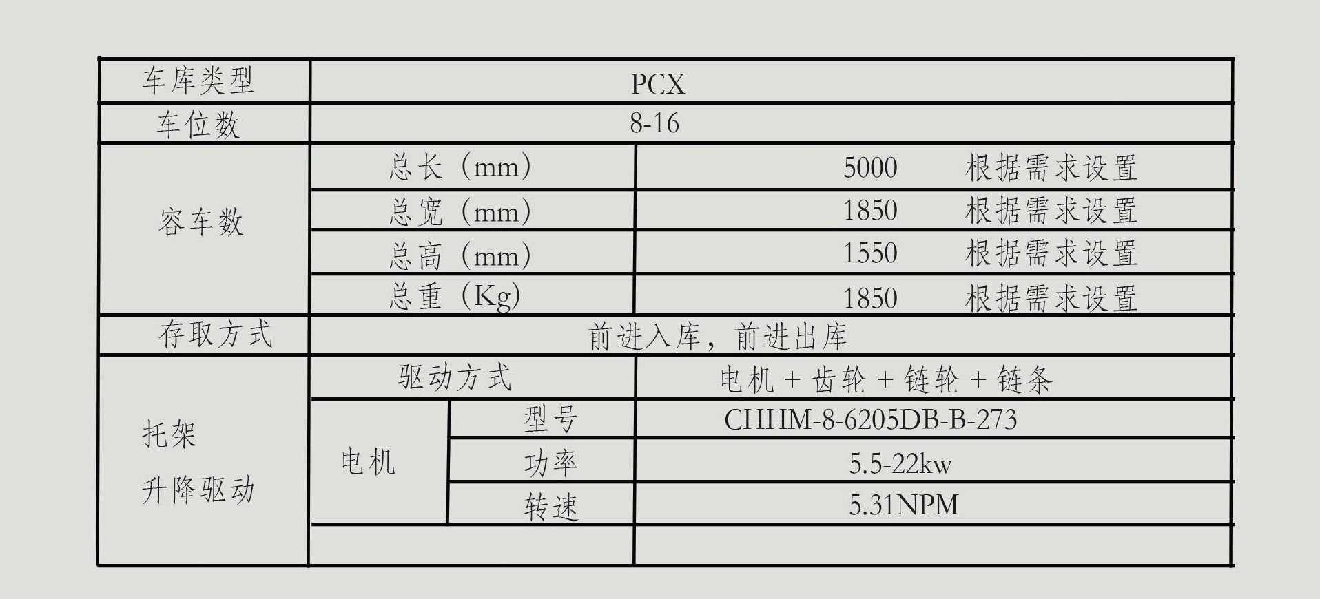 通過減速電機(jī)帶動(dòng)傳動(dòng)機(jī)構(gòu),在牽引鏈條上,每隔一定距離安裝一個(gè)存車拖架,存車拖架隨鏈條一起作循環(huán)運(yùn)動(dòng),從而達(dá)到存取車輛的目的。